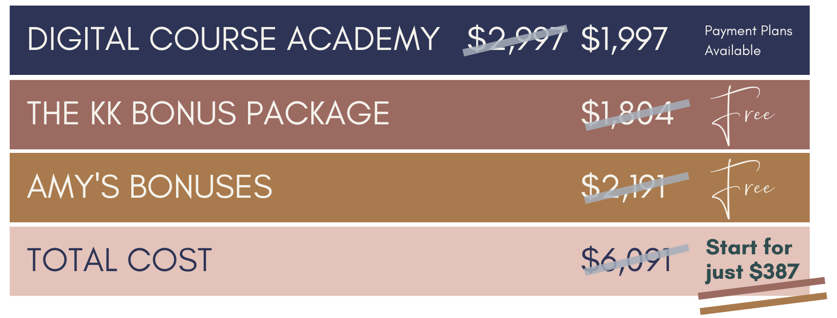 Enroll in Digital Course Academy through the link on this page and you'll get access to my entire bonus suite as my gift to you to help you take action and launch your course!