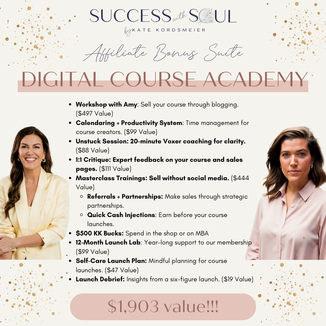 Enroll in Digital Course Academy through the link on this page and you'll get access to my entire bonus suite as my gift to you to help you take action and launch your course!